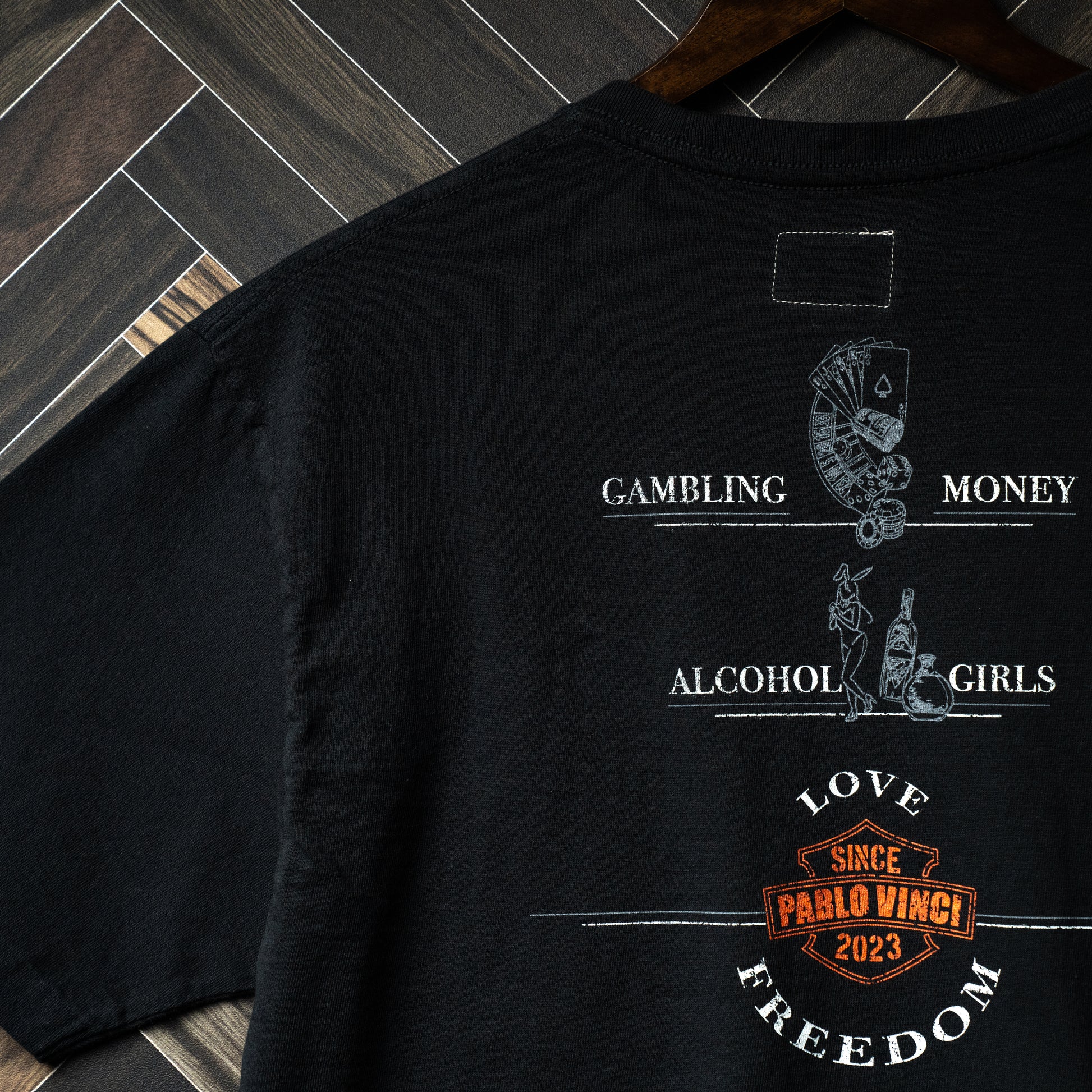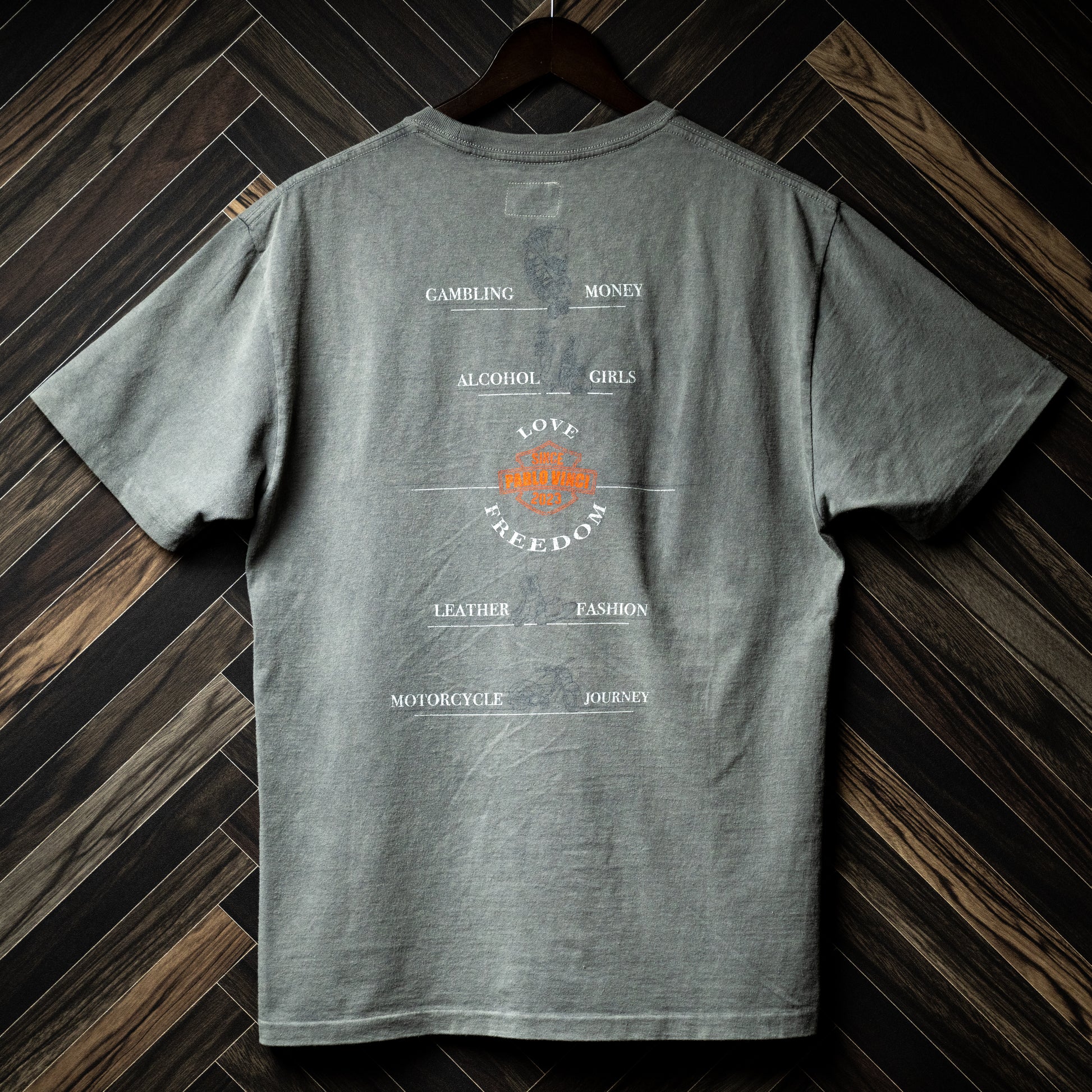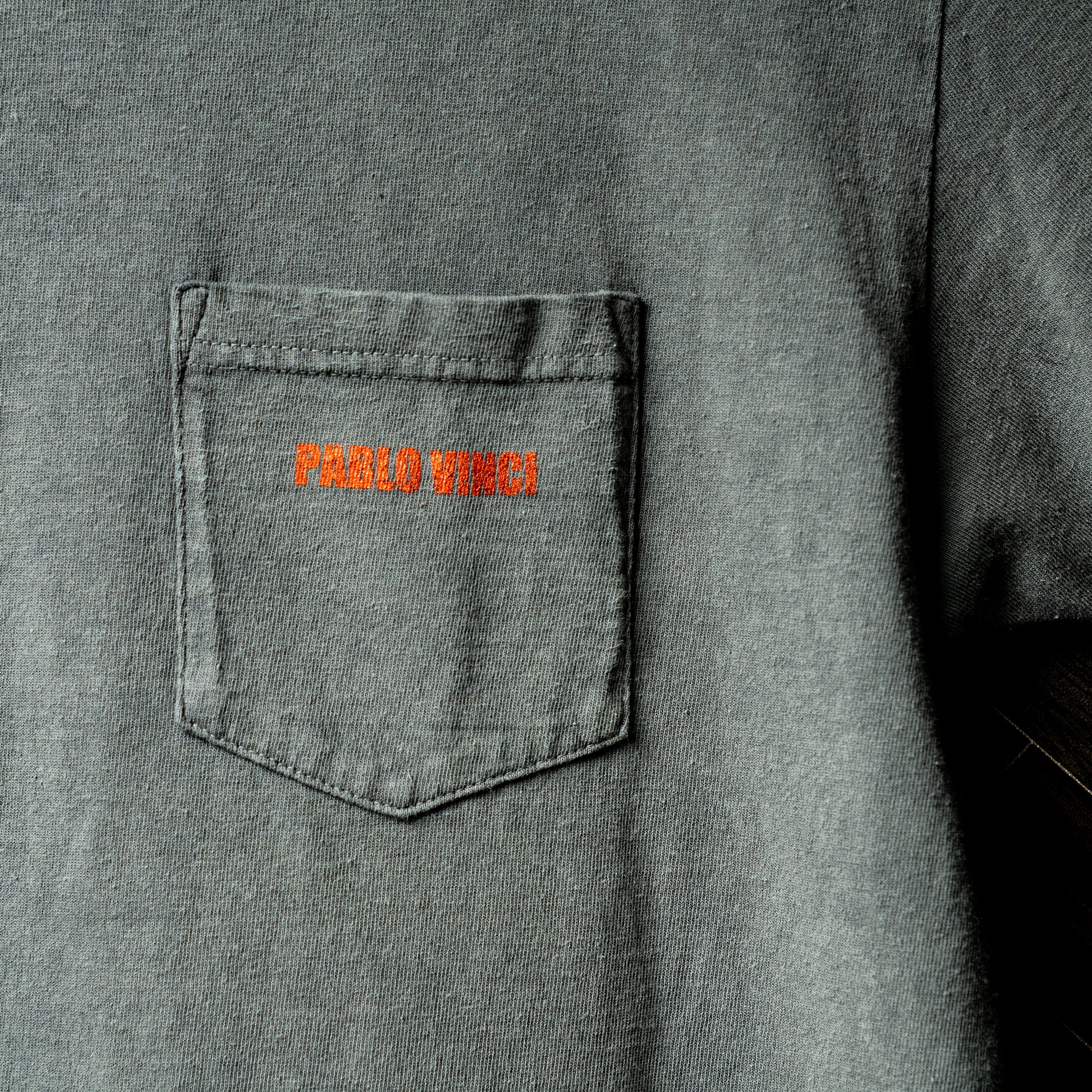 ボディ前後に計6版のシルクスクリーンプリントを施したポケットTシャツです。